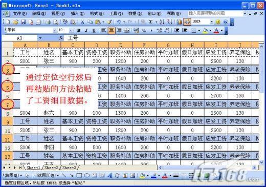 第四步:復(fù)制表頭的工資細(xì)目數(shù)據(jù),選中工資表A列的數(shù)據(jù)區(qū)域,執(zhí)行“編輯”→“定位”命令,在打開的“定位”對話框中單擊“定位條件”按鈕,在打開的“定位條件”對話框中,選擇“空值”,然后單擊“確定”按鈕,這時(shí)會(huì)選中剛插入的空行,執(zhí)行“編輯”→“粘貼”命令,這時(shí)工資條就算制作完成了(如圖7)。