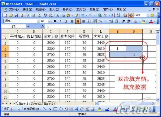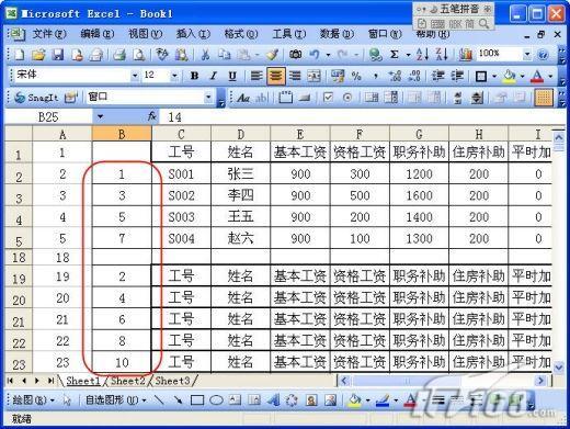接下來在A列的前面插入兩列,第一列使用填充柄輸入序號(hào),從1一直拉到N(本例操作時(shí)為1000,這個(gè)N可根據(jù)自己的喜好以及實(shí)際需求,基本上只要大于工資表中數(shù)據(jù)的兩倍即可),主要用來打印工資條后下次重新做工資時(shí)恢復(fù)表格順序。第二列從第二行開始,依次輸入1、3、5、7,然后選中這四個(gè)單元格,使用填充柄填充至員工數(shù)據(jù)結(jié)束位置。在下方的工資細(xì)目數(shù)據(jù)區(qū),從第一行依次輸入2、4、6、8,然后選中這四個(gè)單元格,使用填充柄填充至結(jié)束,大致效果如圖3所示。