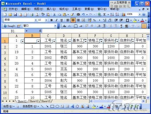 從上圖中可以看出,工資條效果已經(jīng)實(shí)現(xiàn)了,這時(shí)將A、B兩列隱藏,然后打印,我們的工作就算完成了。等下個(gè)月需要使用這張工資表格重新計(jì)算工資時(shí),只需要將隱藏的A、B兩列取消隱藏,使用“自動(dòng)篩選”,然后按照A列“升序排列”即可還原原來的順序。